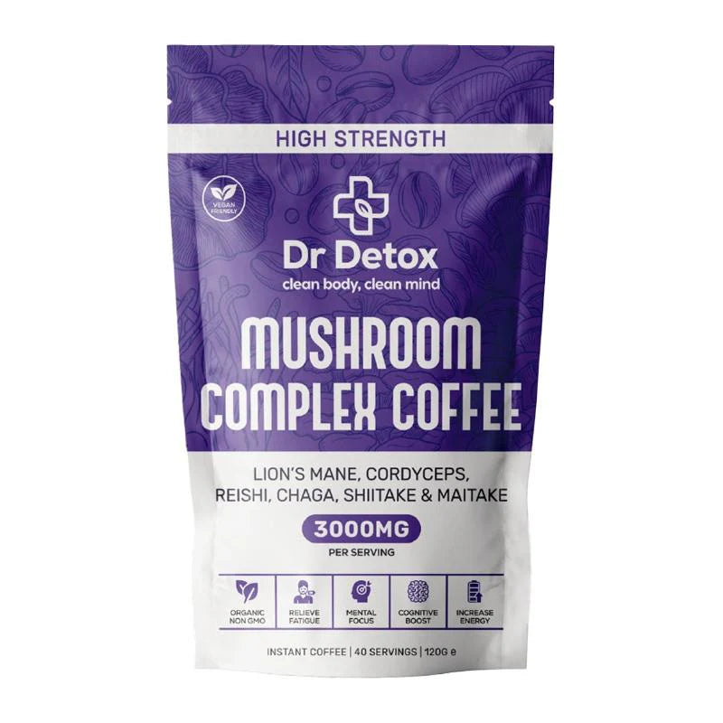 Dr Detox Mushroom Coffee Blend is a natural dietary supplement formulated to combat fatigue, sharpen mental focus, and elevate overall energy levels. This organic, non-GMO blend combines the ancient wisdom of medicinal mushrooms with modern convenience, offering a delicious and easy way to support your health. Ideal for daily use, this coffee blend helps you stay alert, focused, and revitalized throughout the day.